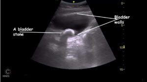 An ultrasound examination often confirms a stone’s presence as well. (read here) Stones less than 3 mm in diameter can be very difficult to see. X-rays and ultrasound also tell your veterinarian the urgency of your pet’s situation. Bladder stones that have a diameter greater than that of your dog’s urethra are unlikely to enter the urethra and block the flow of urine. Those considerably smaller will likely pass out with the urine. But those that are approximately the same diameter as your dog’s urethra could block the flow of urine if they get stuck in the pet’s urethra on their way out – causing a medical emergency that could happen at any time. (read here) If your veterinarian suspects Cushing’s disease as a predisposing factor, test for that condition might be indicated as well.